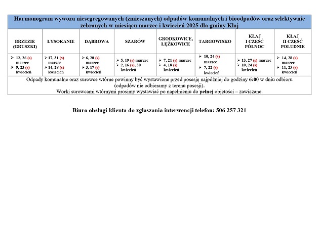 Prosimy o zapoznanie się z harmonogramem wywozu odpadów komunalnych na marzec i kwiecień 2025 r. przekazanym przez firmę zajmującą się wywozem odpadów z terenu Gminy Kłaj.