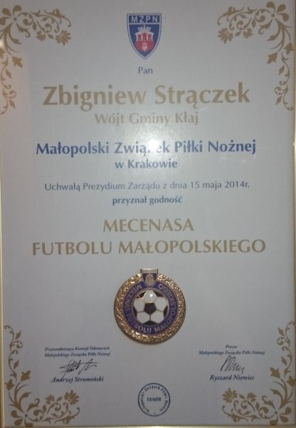 Decyzją Komisji Odznaczeń Małopolskiego Związku Piłki Nożnej, Wójt Gminy Kłaj – Zbigniew Strączek otrzymał godność Mecenasa Futbolu Małopolskiego.