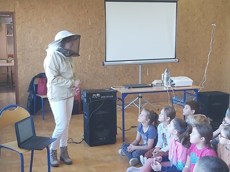 25 listopada w szkole w Brzeziu odbyło się spotkanie z Panią Anną Job, która na co dzień prowadzi pasiekę. Opiekuje się ponad czterdziestoma ulami. Pani Ania podzieliła się z nami informacjami, które udało się jej zebrać z kilku lat pracy w pasiece. Opowiedziała o życiu pszczół, ich zwyczajach, o hierarchii jaka panuje w każdym ulu. Przywiozła ze sobą również narzędzia, które są jej potrzebne w opiece nad pszczołami. Nasi uczniowie i przedszkolaki mogły również przymierzyć profesjonalny strój, którego używa, aby w bezpieczny sposób wykonywać taką ważną pracę. Pani Ania przywiozła ze sobą również zaangażowanie, miłość do swojej pracy, a co najważniejsze nauczyła dzieci szacunku do tych pracowitych i potrzebnych owadów.
